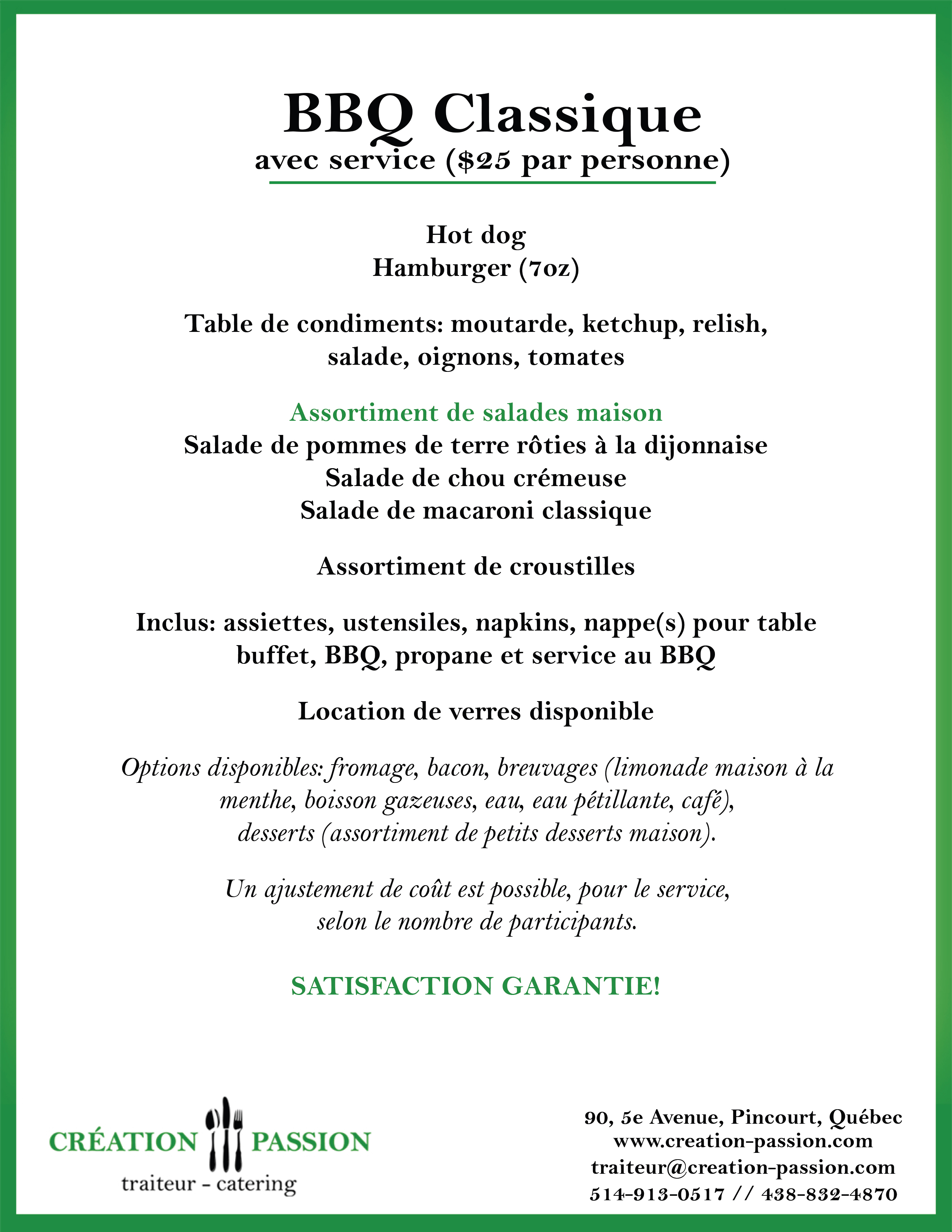 Les étés québécois sont courts, quelle meilleure façon de profiter de l'été avec des amis, la famille ou des collègues de travail que d'avoir un BBQ. Laissez-nous toute la planification et la préparation pour votre occasion spéciale.