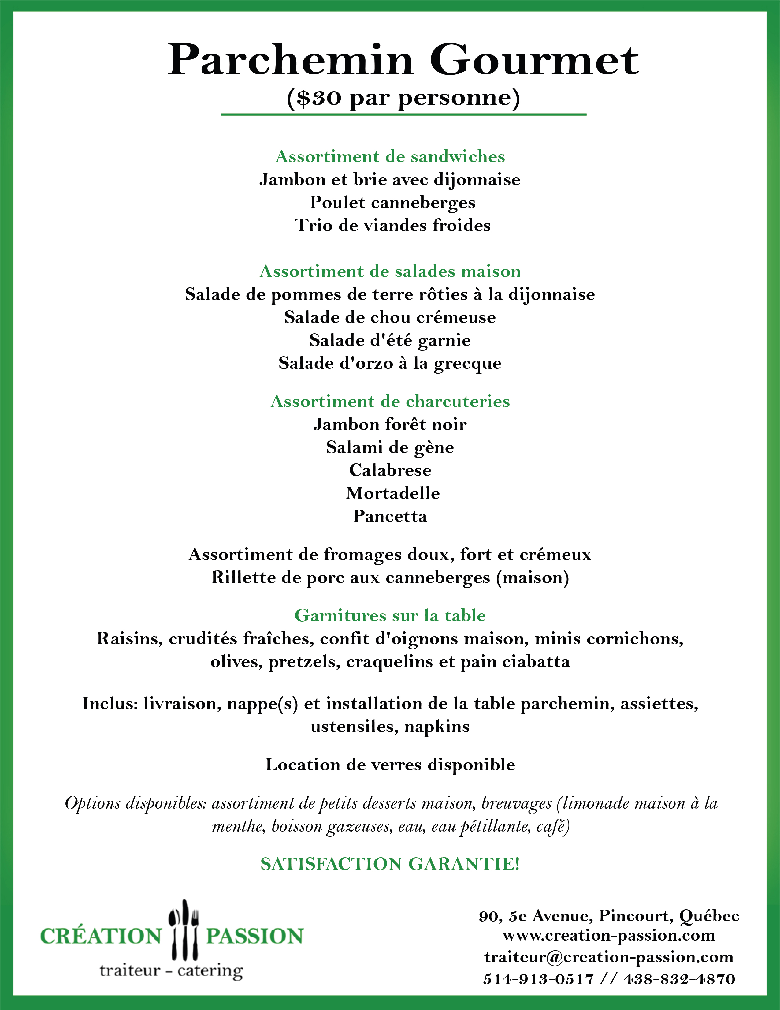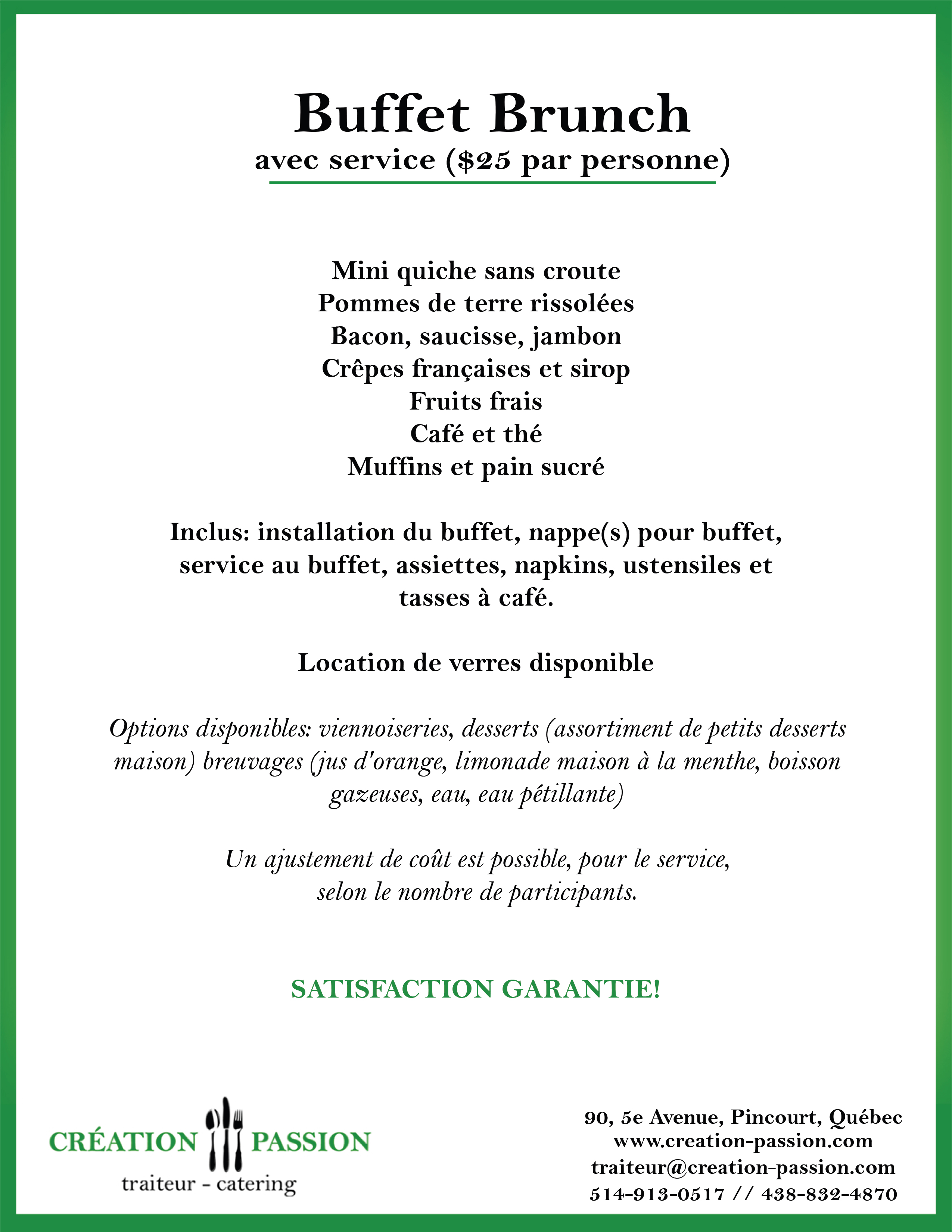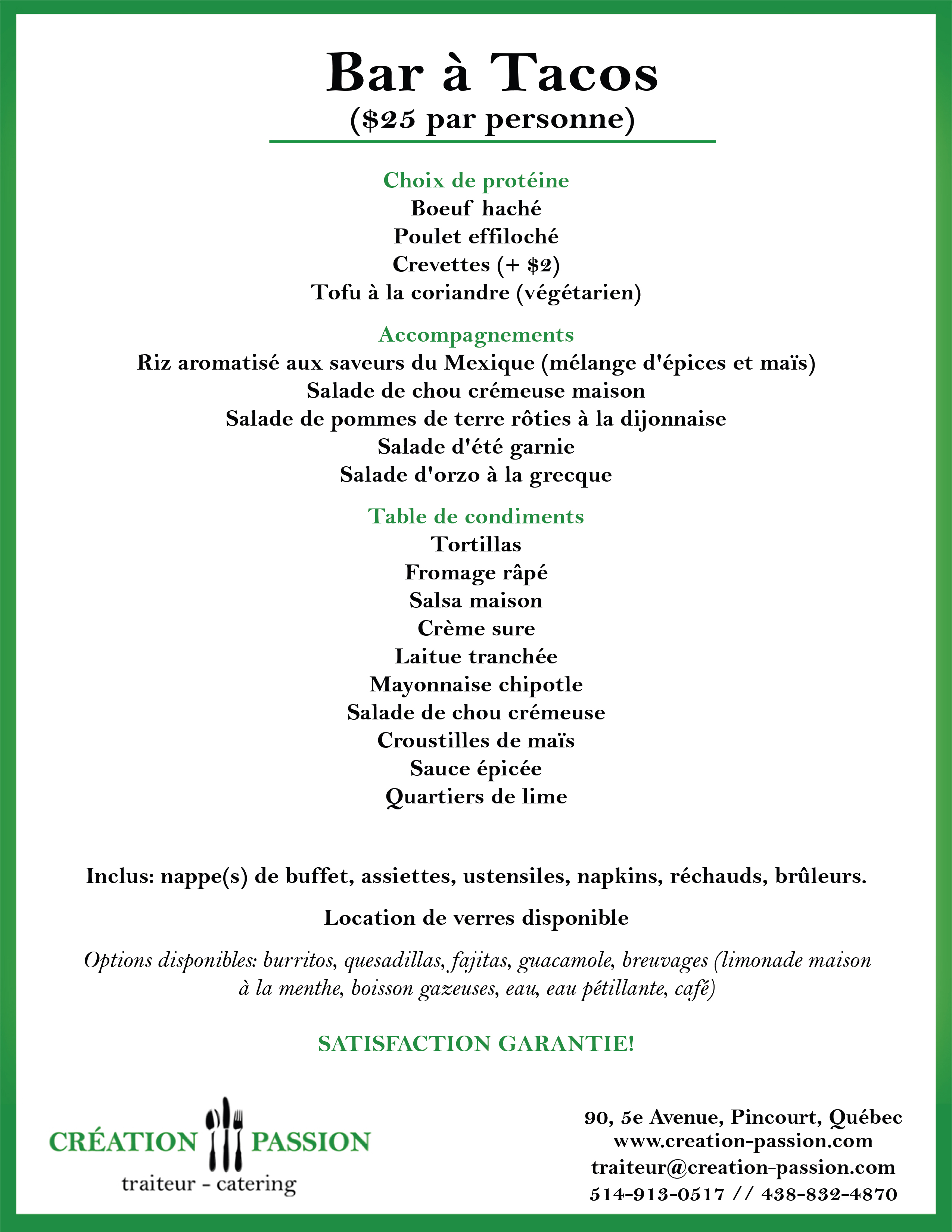 Voici ce que nous proposons actuellement, cependant nous sommes heureux de personnaliser un menu pour votre événement!