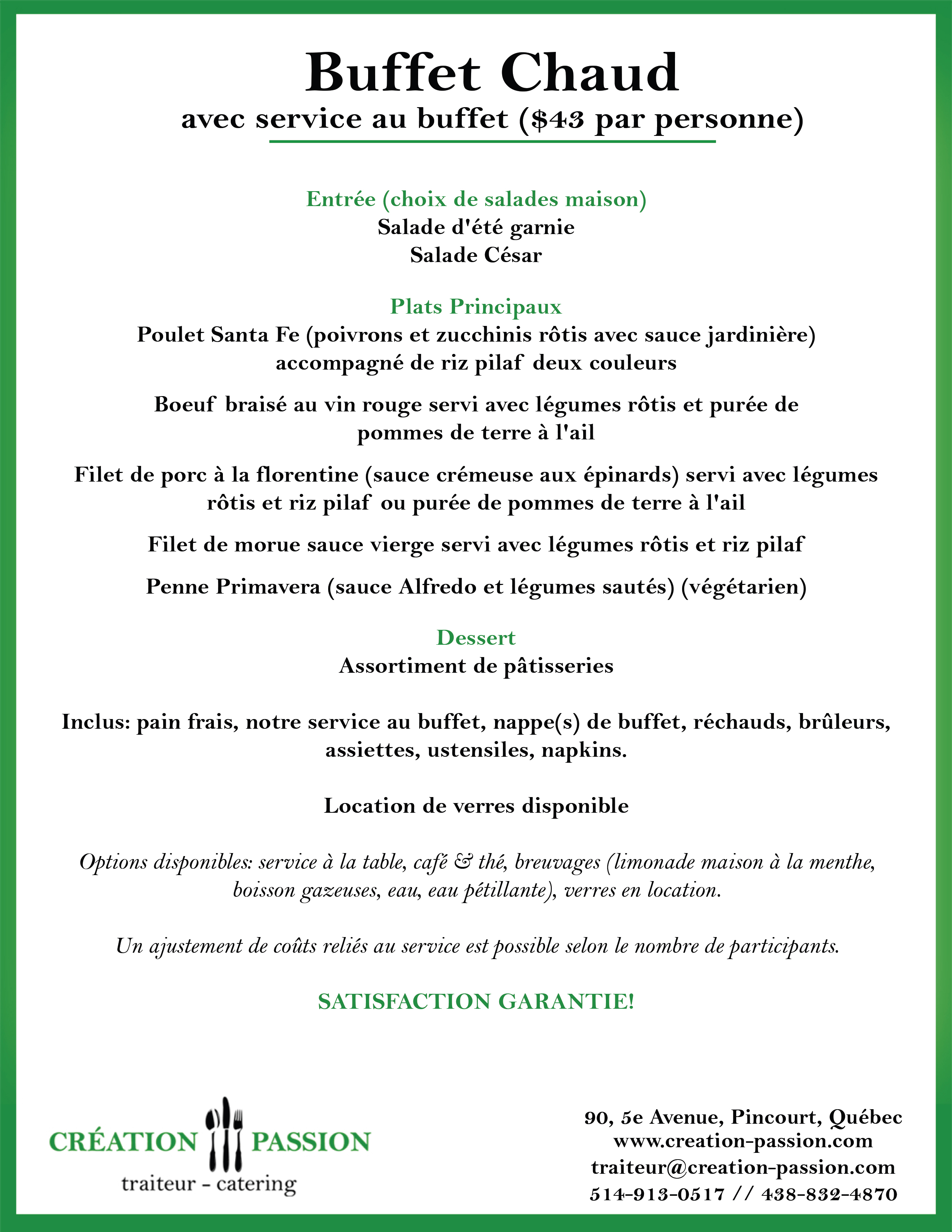 Ce sont des exemples de menus populaires, il nous fera plaisir de personnaliser nos menus à vos besoins.