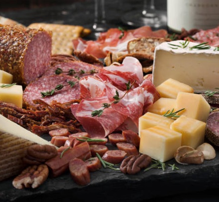 Assortiment de viandes froides. Rillette au porc, canneberges et fines herbes. Assortiment de fromages doux, forts et crémeux. Confit d'oignon, cornichons, olives, crostinis, craquelins, et raisins. Pour 4 à 6 personnes.