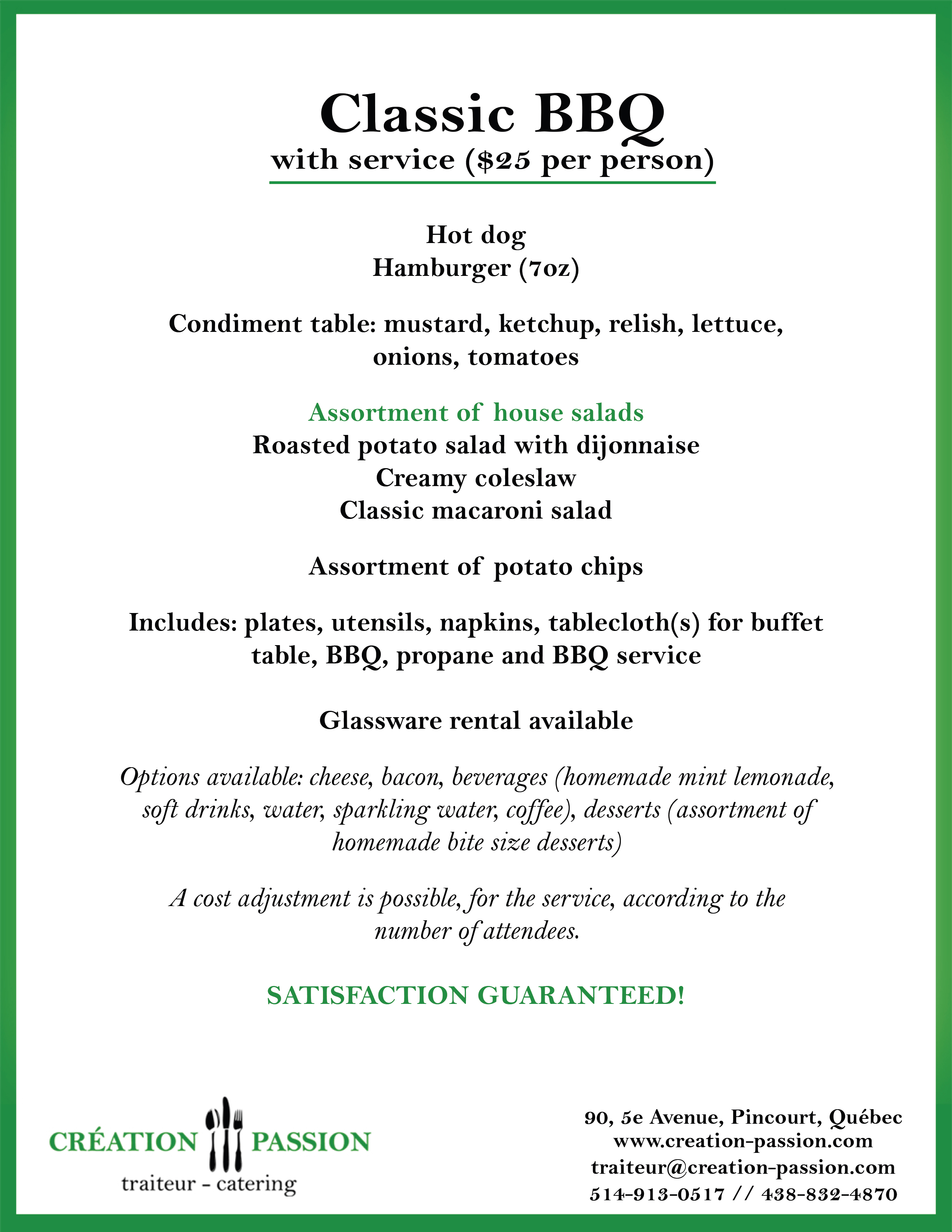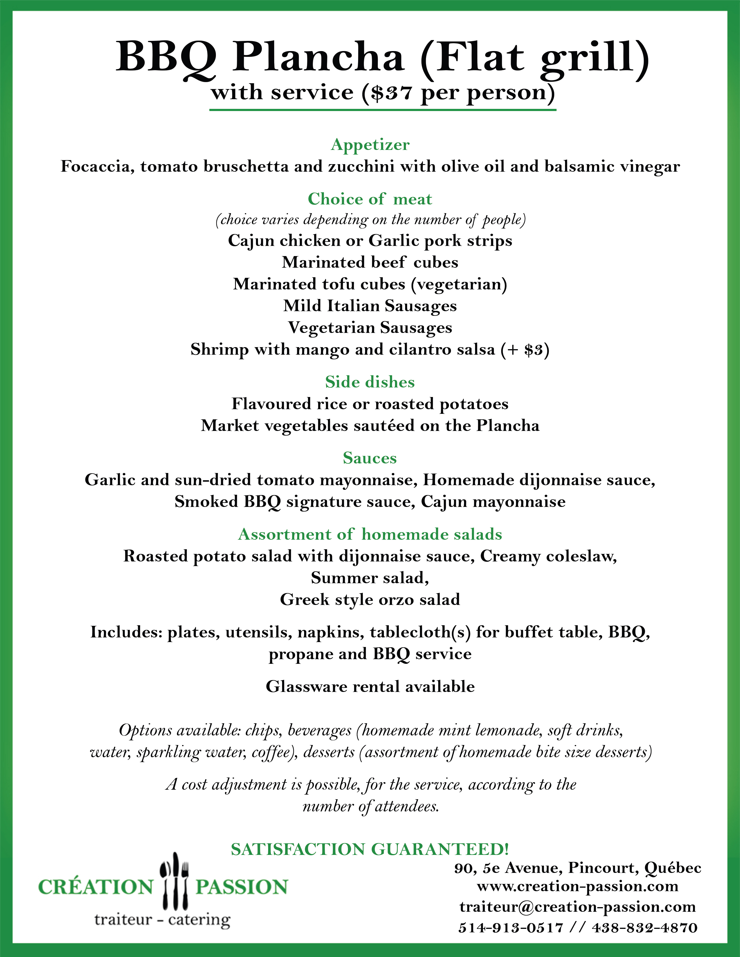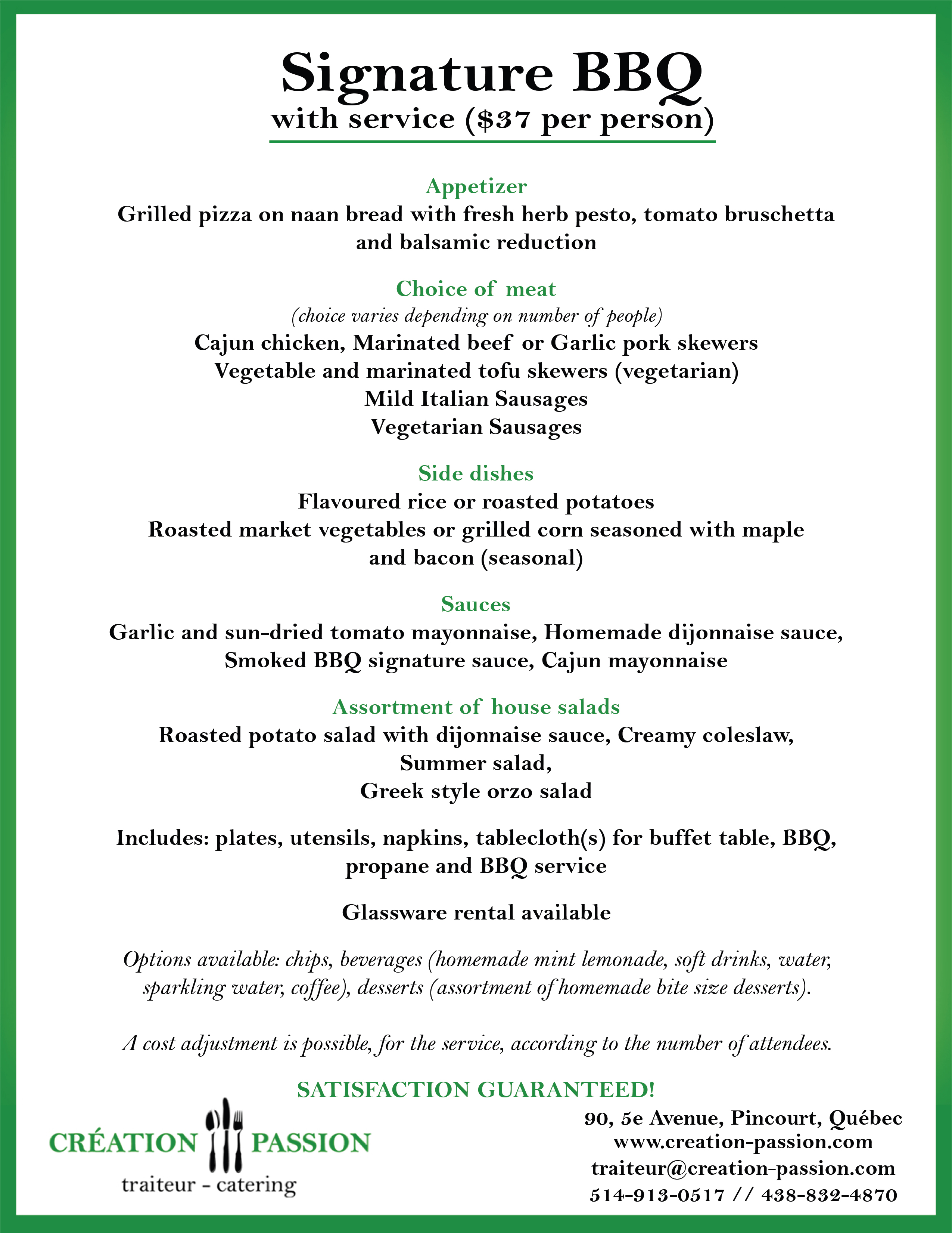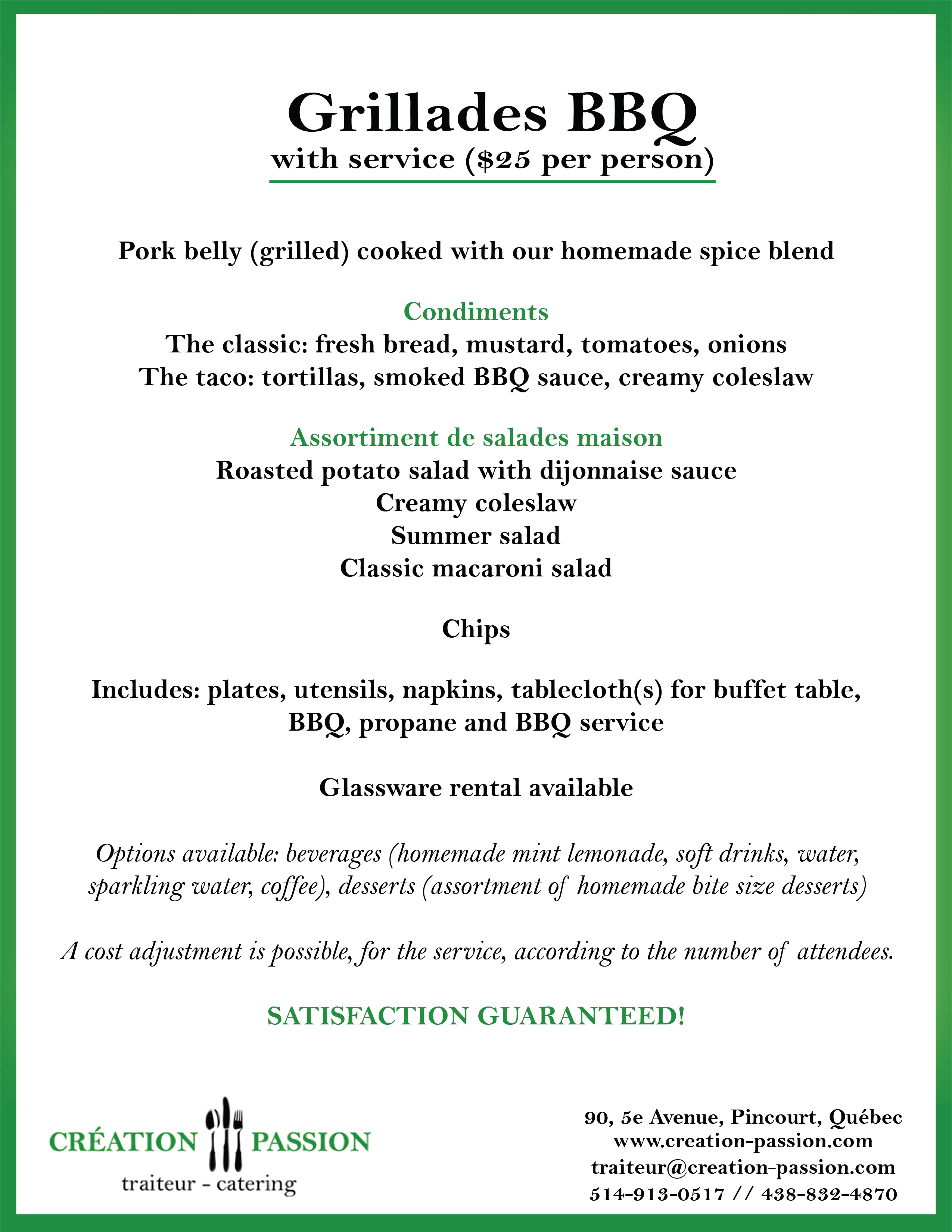 Quebec summers are short, and what better way to enjoy this time with friends, family or co-workers than having a BBQ? Leave all the food planning and prep on your special occasion to us. We'll even bring dishes and the Q to you!