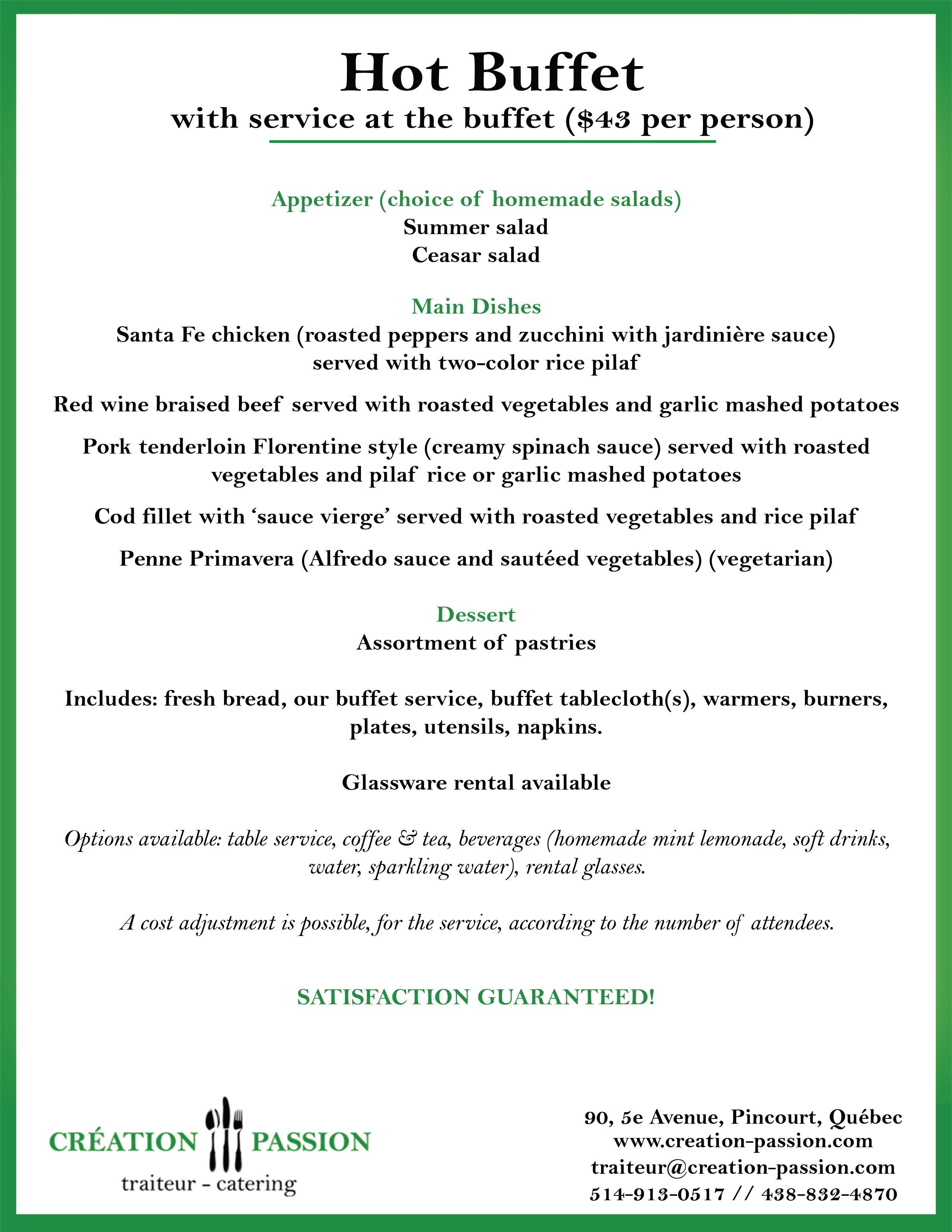 Santa Fe chicken, Beef braised in red wine, Florentine-style pork tenderloin, Cod fillet with 'sauce vierge', Penne Primavera (vegetarian) and their sides. Served with salad and dessert.