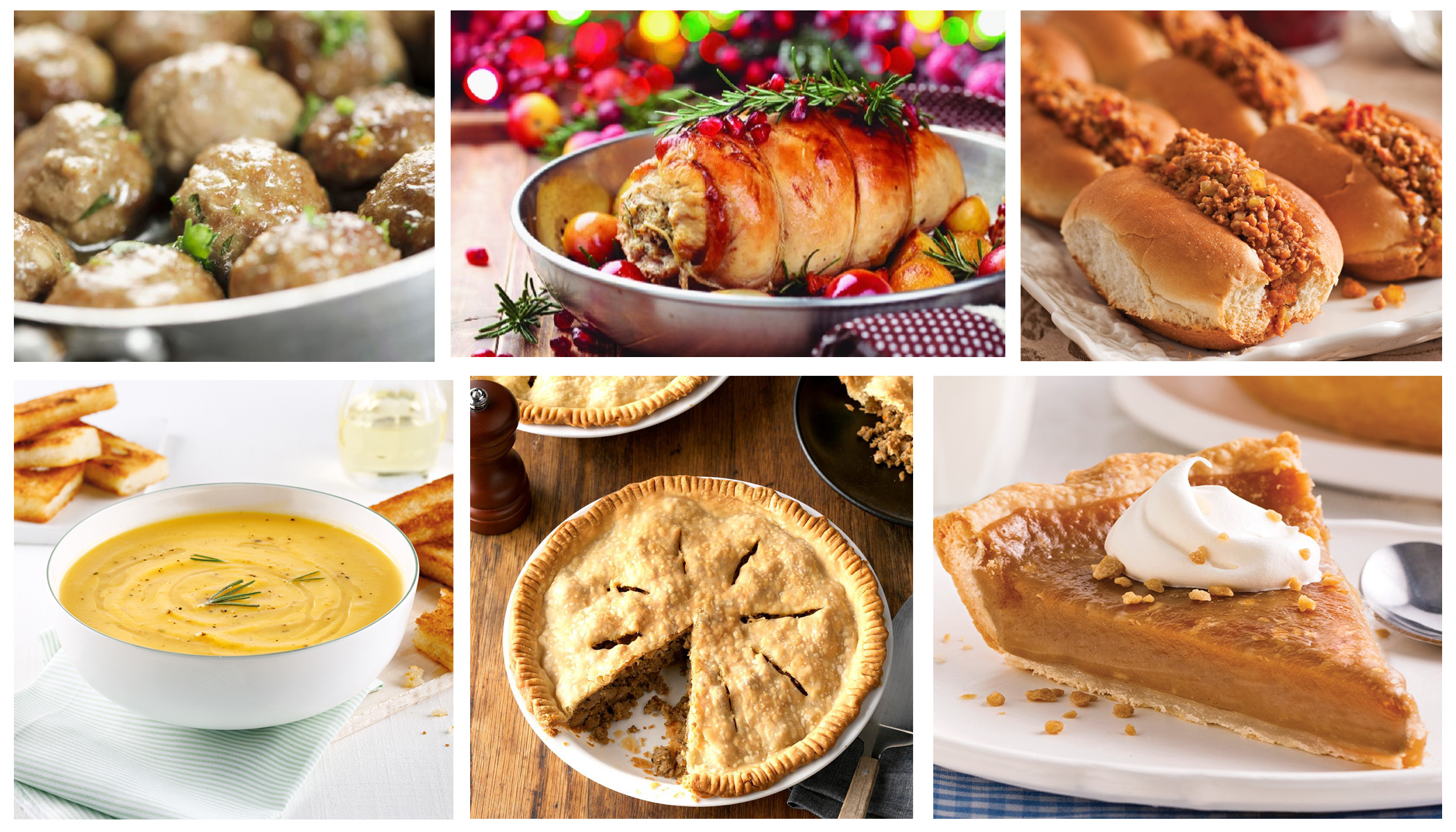 Tous vos classiques réunis dans un buffet! Potage, salade, ragoût de boulettes, tourtière maison, dinde garnie (brie, bacon, sauce canneberge), sauce à la dinde, purée de pommes de terre et légumes rôtis.