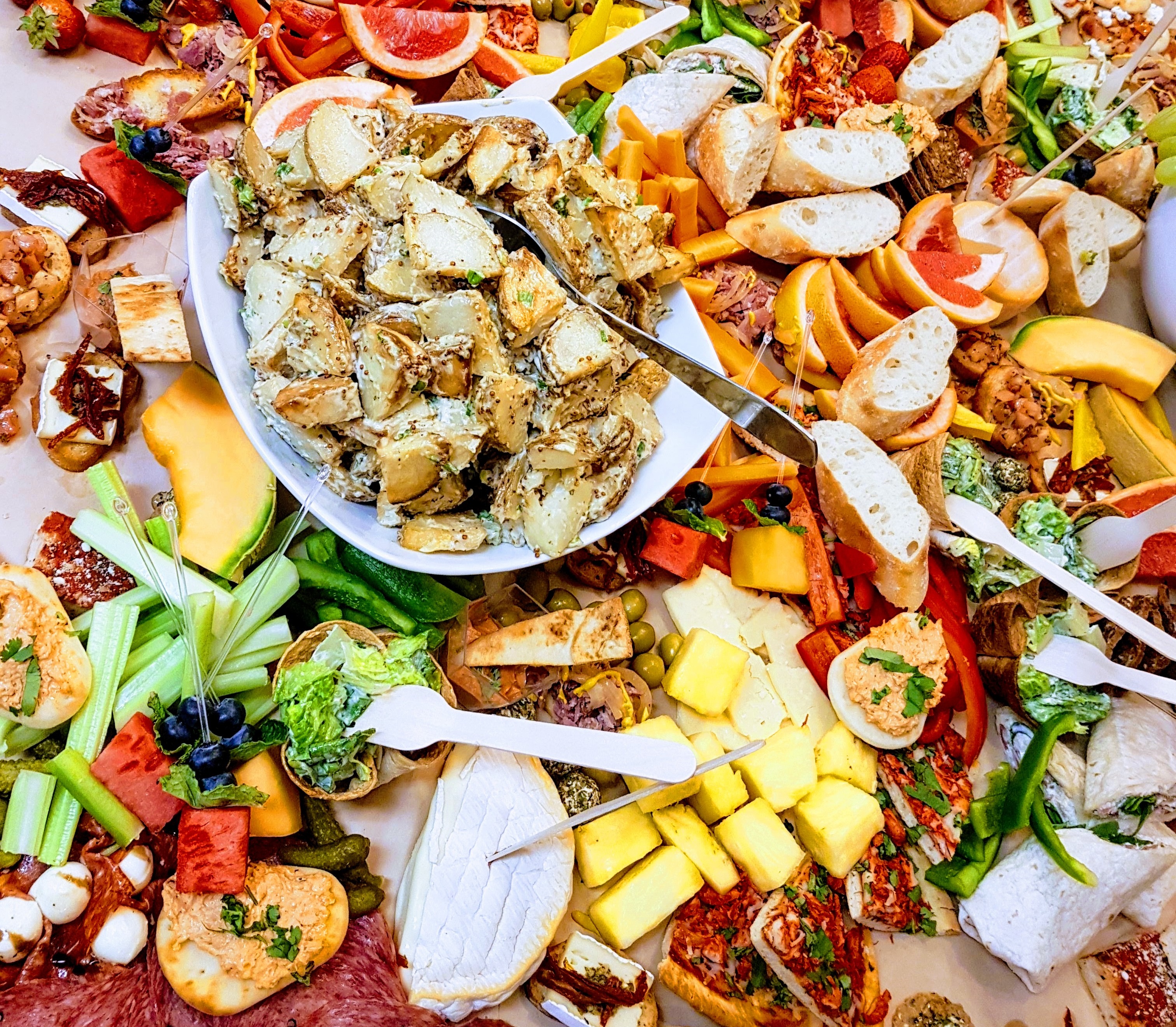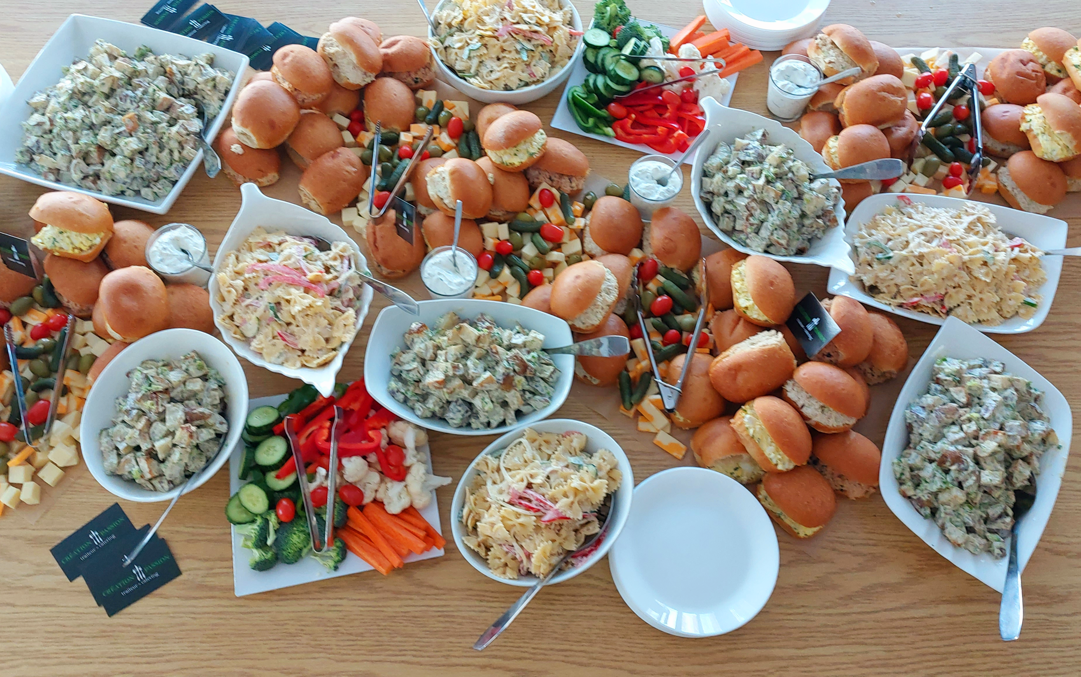 Assortiment de sandwiches (salade de jambon, salade de poulet, salade aux oeufs). Cruditées, trempette, olives et cornichons. Salade de pommes de terre rôties à la dijonnaise. Salade de pâtes à la grecque. Fromage en cubes. Assortiment de mini desserts.