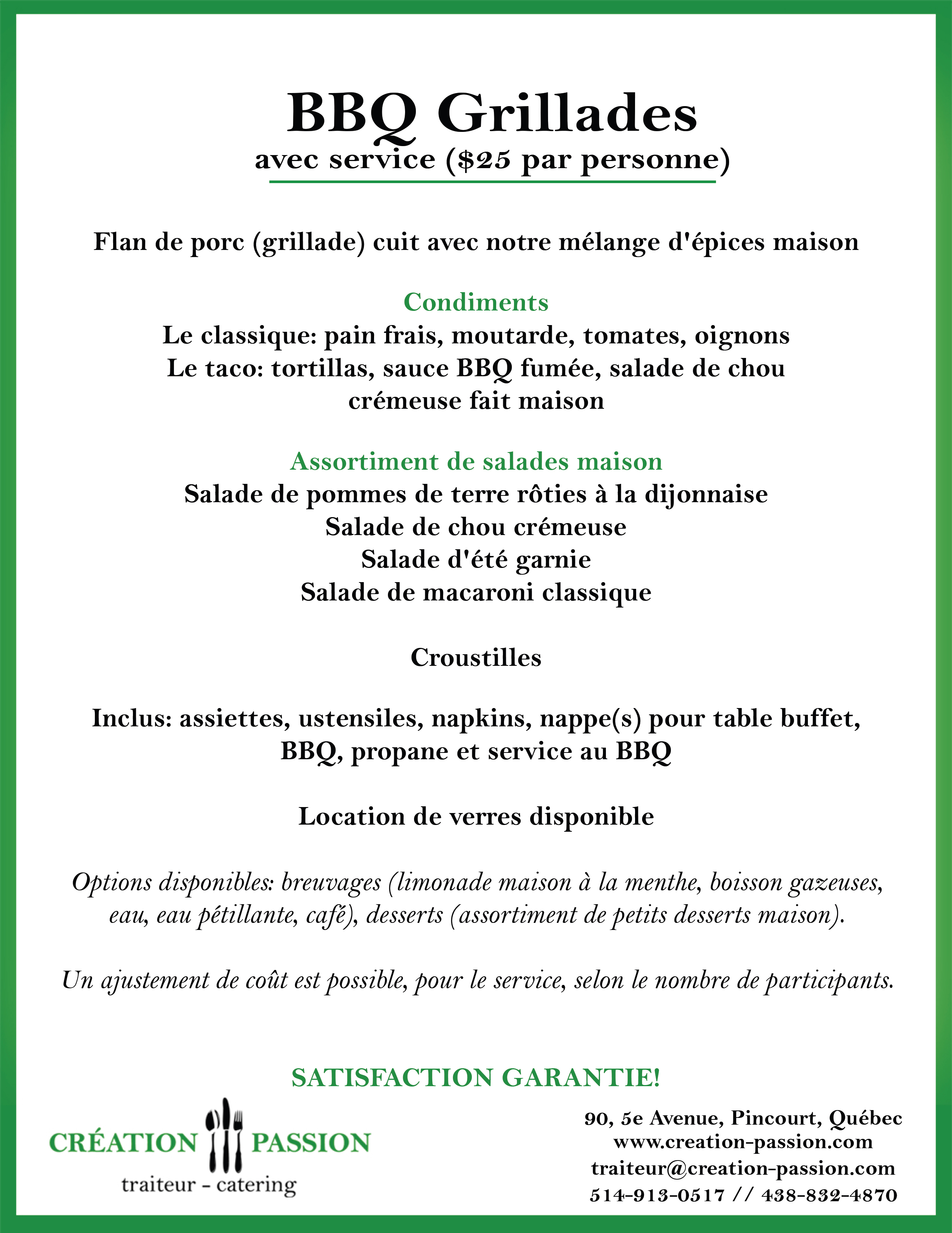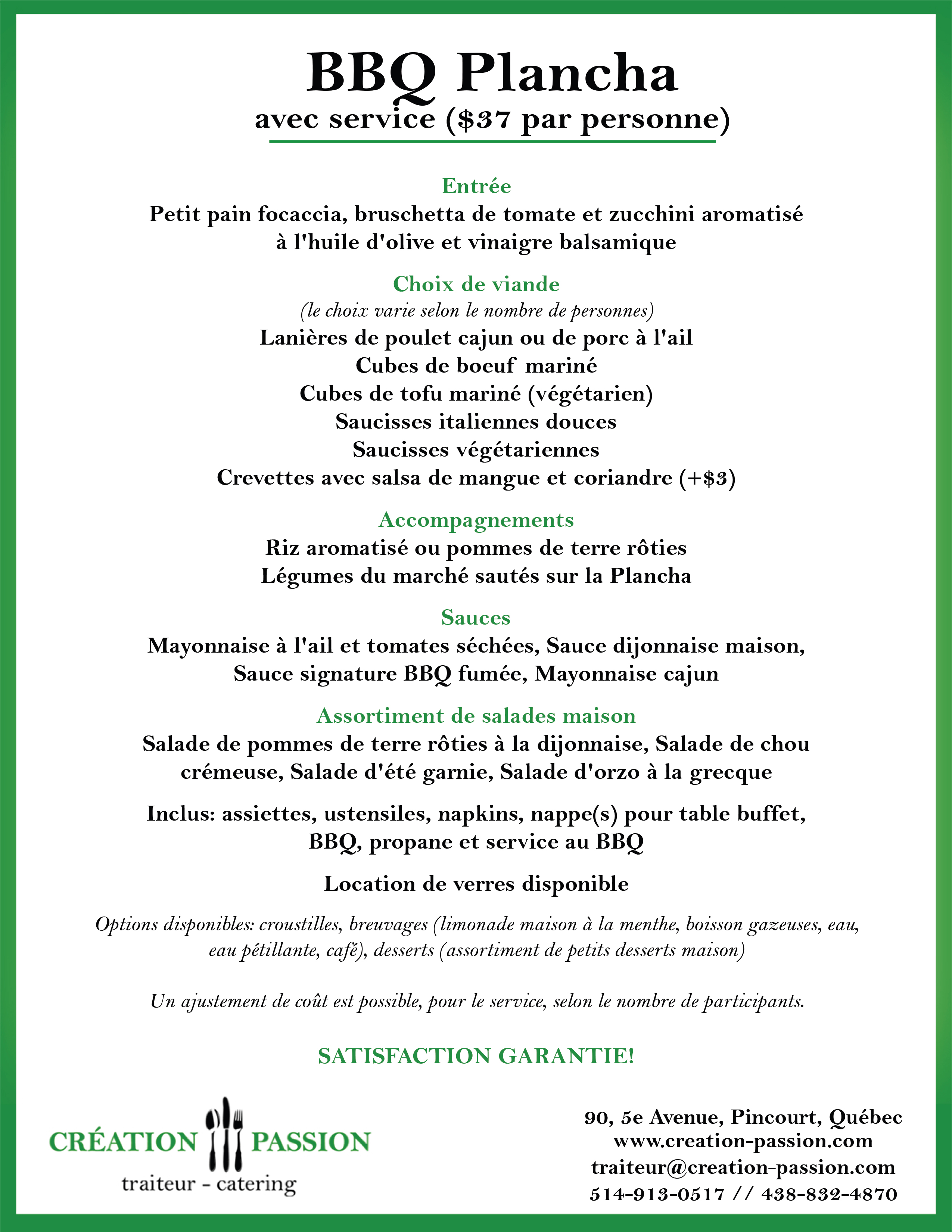 Les étés québécois sont courts, quelle meilleure façon de profiter de l'été avec des amis, la famille ou des collègues de travail que d'avoir un BBQ. Laissez-nous toute la planification et la préparation pour votre occasion spéciale.