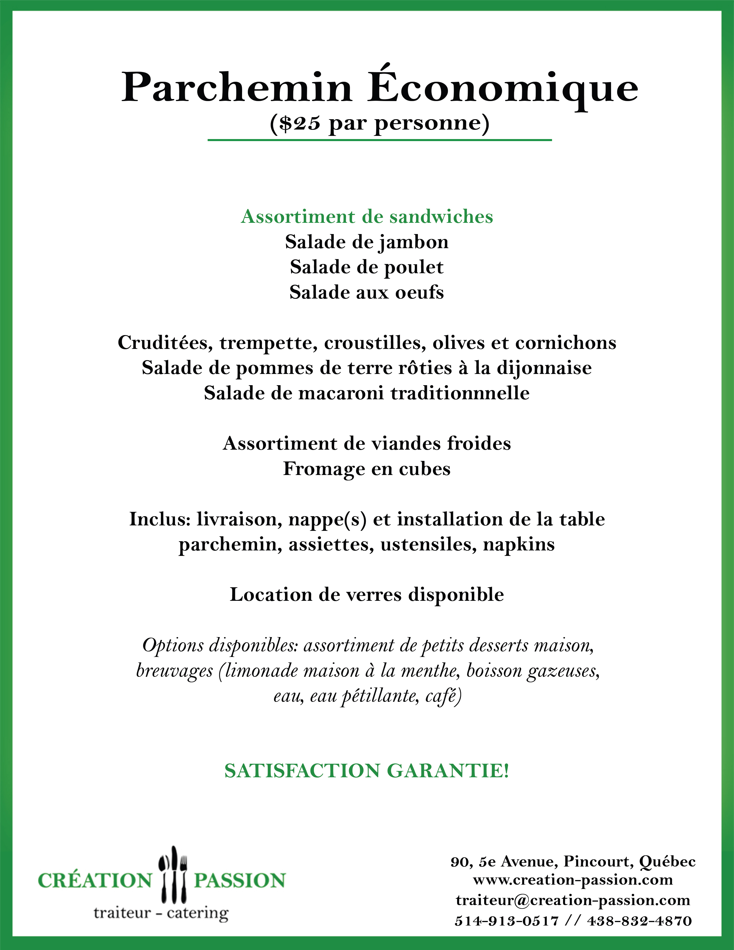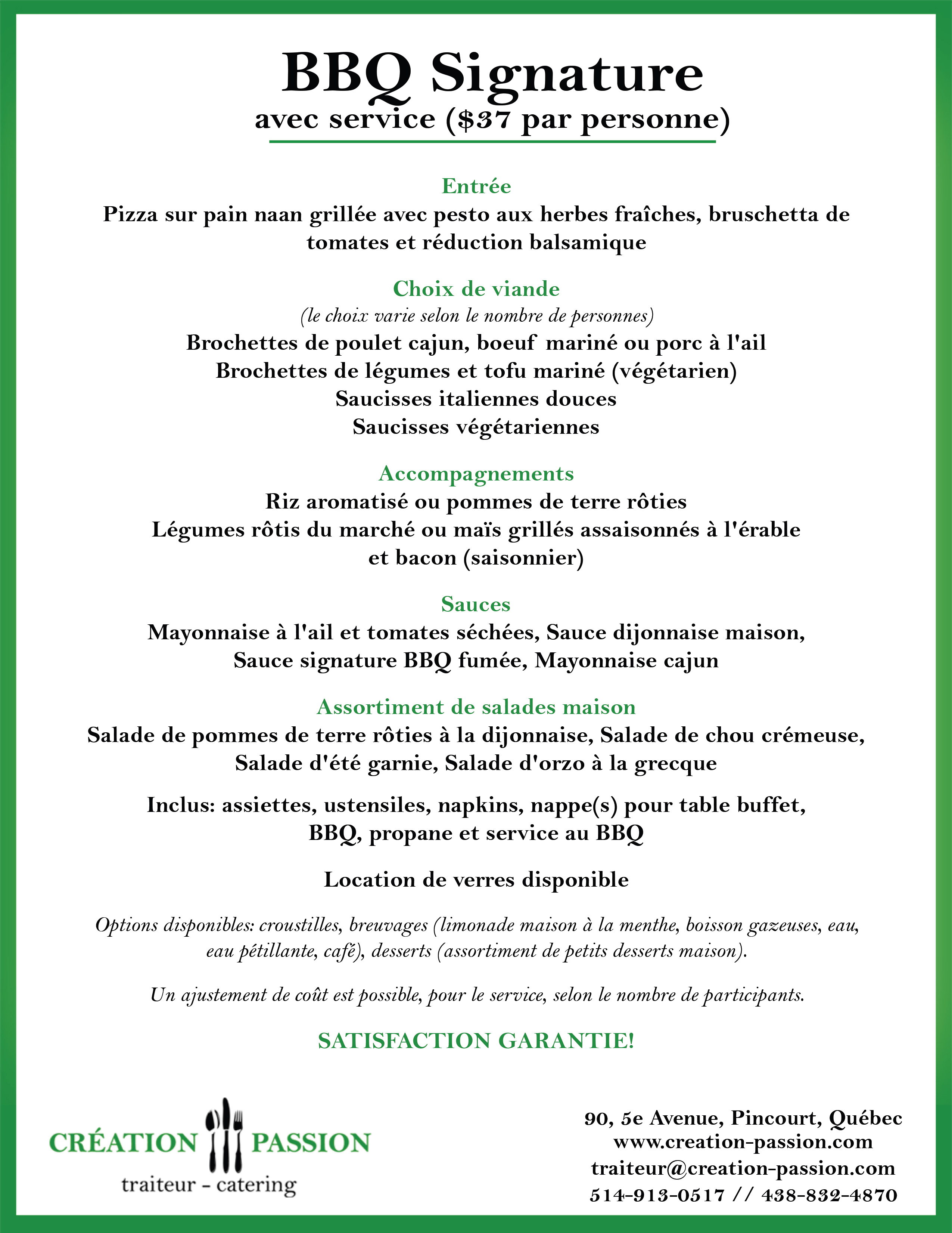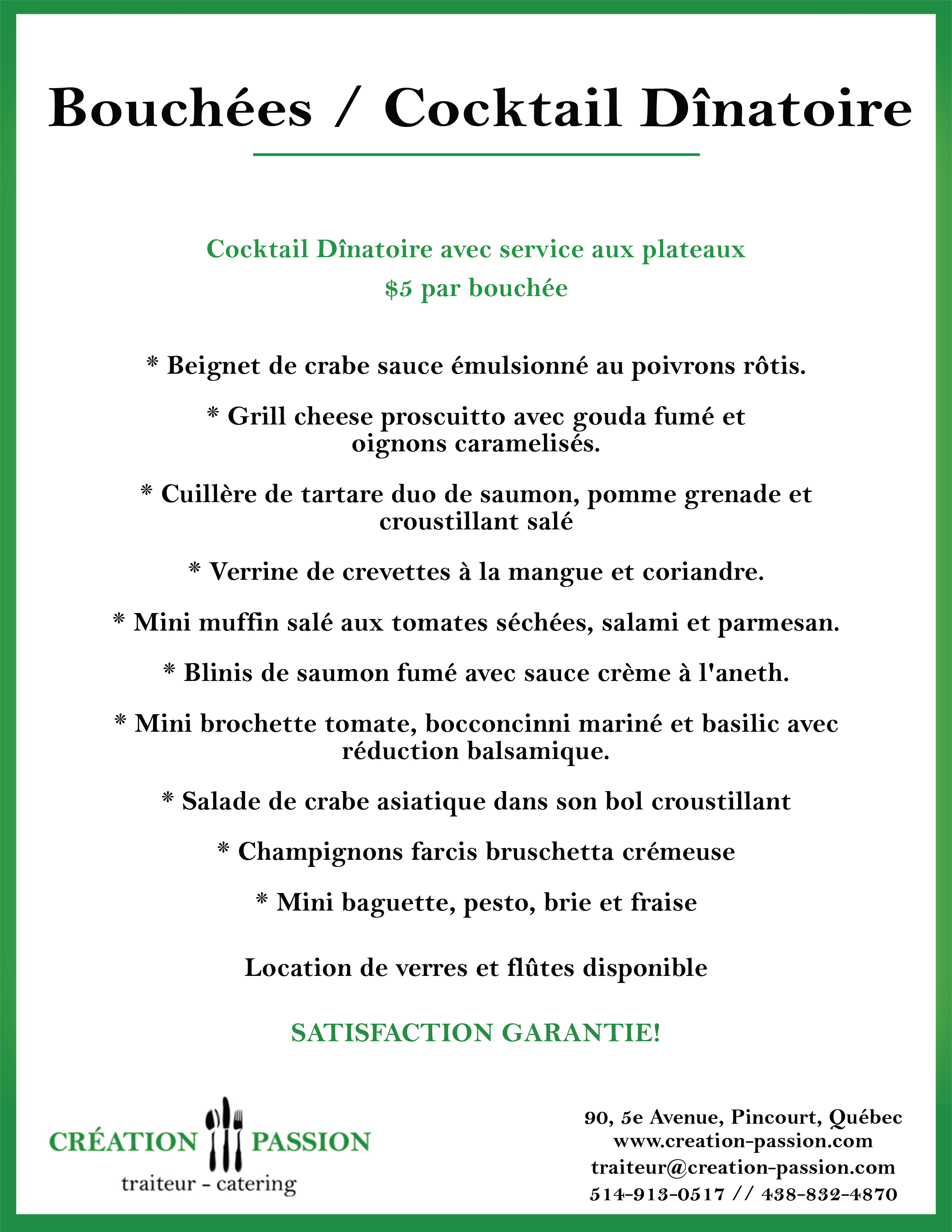 Ce sont des exemples de menus populaires, il nous fera plaisir de personnaliser nos menus à vos besoins.