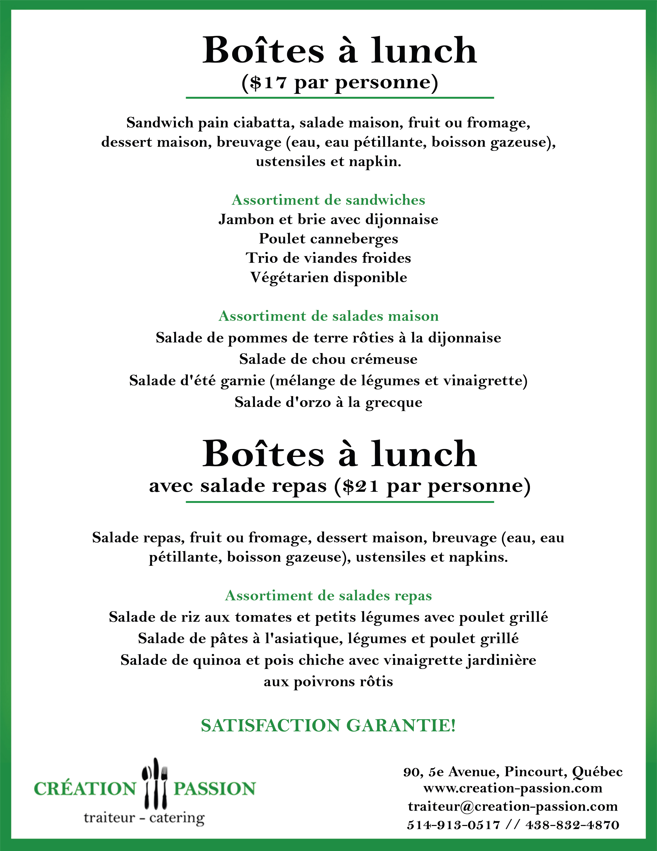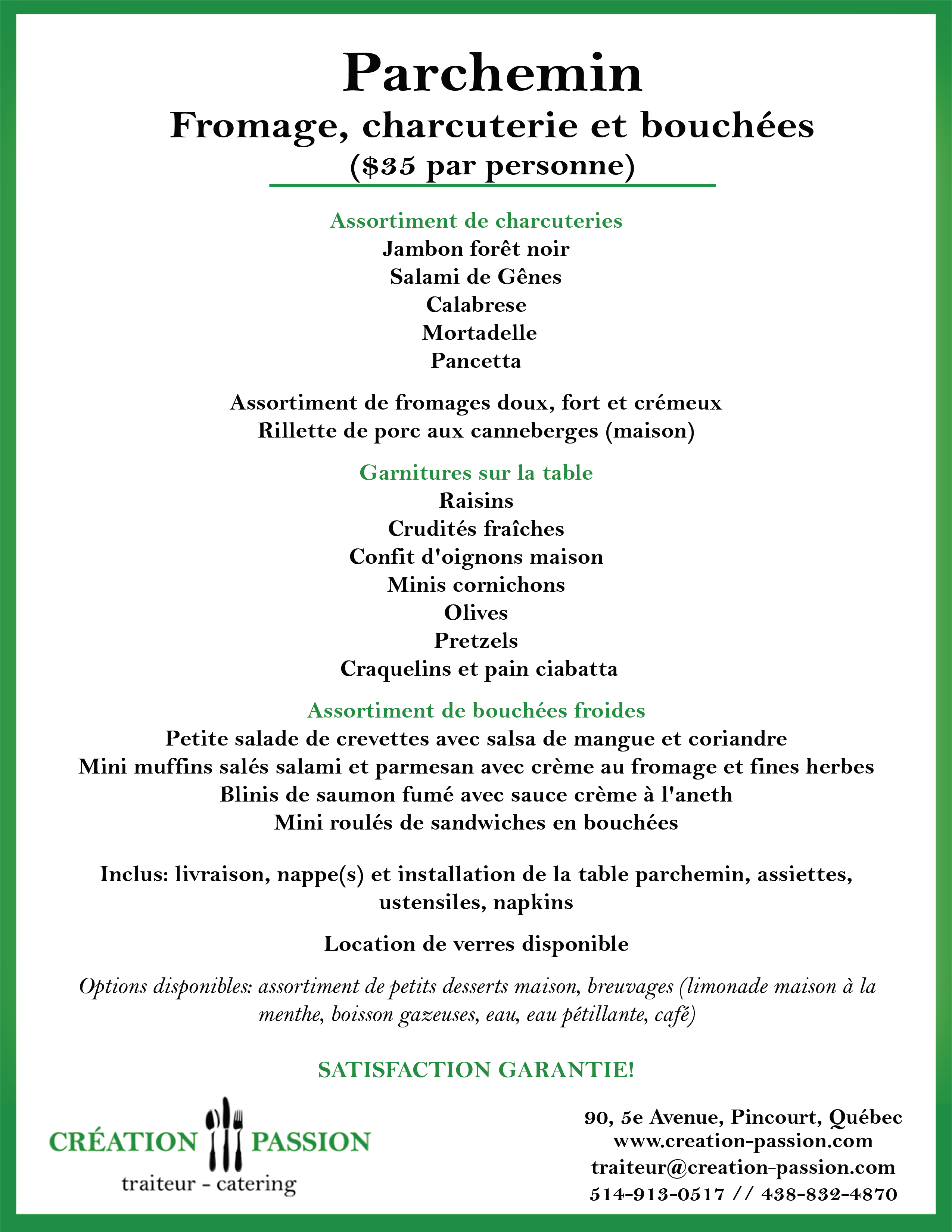 Voici ce que nous proposons actuellement, cependant nous sommes heureux de personnaliser un menu pour votre événement!